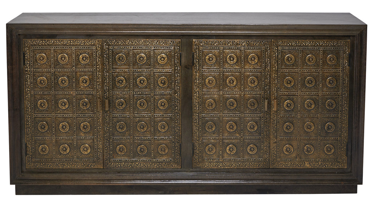 The Cabinet is Constructed of Natural Mango Hardwoods using tongue and groove joint methods. Walnut stain finishing of the wood work beautifully with the Oil Rubbed Golden tones of the Clad Metal Doors. Consider combining this with the new Arabesque upholstery Collection also available for the creation of a complete Living Room. Hand Made and Hand Finished in India for AFD Home. Arrives Fully Assembled, Enjoy!