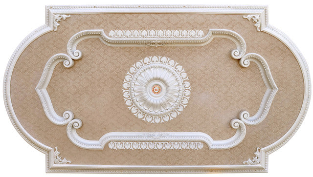 Blanco Rectangular Chandelier Ceiling Medallion 94 inch is a large fully assembled and intricately finished Ceiling Medallion. Measuring 94 X 3 X 51. This creation comes prefinished in a tasteful Blanco Finish, a subtle contrast of neutral White and Beige featuring a recessed center panel with slightly raised floral pattern detail.