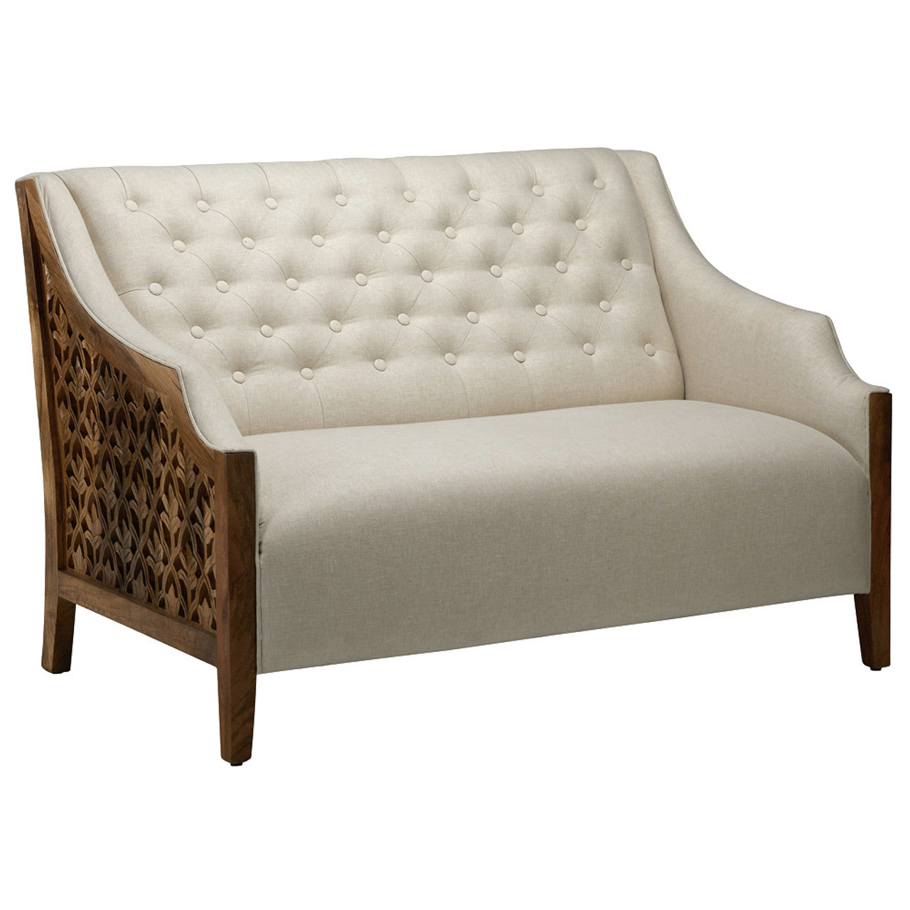 Naturally finished with a satin sheen that protects and enhances the wood. The grain of the Mango Wood offers beautiful variations of natural color with rich depth and tone. The tailoring of the seating is well done with a neutral Linen and button tufted backs that offers a beautiful synergy with the wood. Loveseat Sold Seperately ,but the new Chalet Natural Pierced Carved Upholstery Group offers options for matching with either the Chalet Chair
