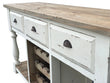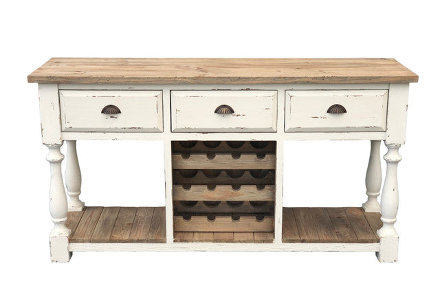 The Farmhouse Console Wine Rack White Chalk Finish and Natural Top is hand made using Authentic Reclaimed New Zealand Pine. The finish is an appropriate finish for the period and combines the natural aged Pine with a contrast of old fashioned Casein Chalk White Finishing.