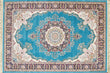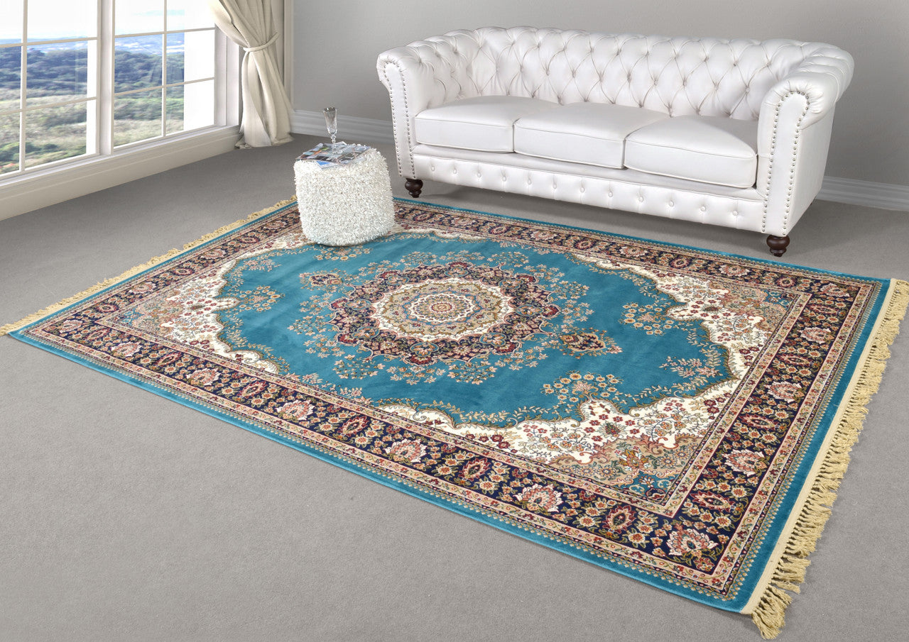 One of the newest additions is this beautiful 7 x 10 foot room sized rug from our spectacular, Kashan Design Blue Collection. So striking in beauty and first impression. This is spectacular color combination with Turquoise Teal Blue Fields surrounded by exciting accent colors offering contrast with dark Black Blue, Cream and touches of Burgandy. Designer's understand that floor is the foundation of any well designed room as we naturally look were we walk.