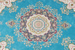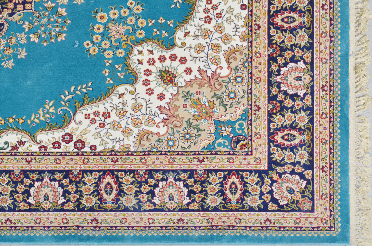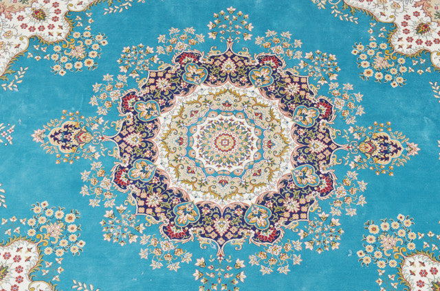 One of the newest additions is this beautiful 9 x 11 foot room sized rug from our spectacular, Kashan Design Blue Collection. So striking in beauty and first impression. This is spectacular color combination with Turquoise Teal Blue Fields surrounded by exciting accent colors offering contrast with dark Black Blue, Cream and touches of Burgandy.