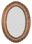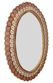 Peruvian Reverse Scalloped Oval Mirror is 41" wide and 58" tall it features rich varying sienna, umber and gold tones creating depth and contrast in this reverse painted art mirror. Set into a scalloped edge carved oval wood frame.