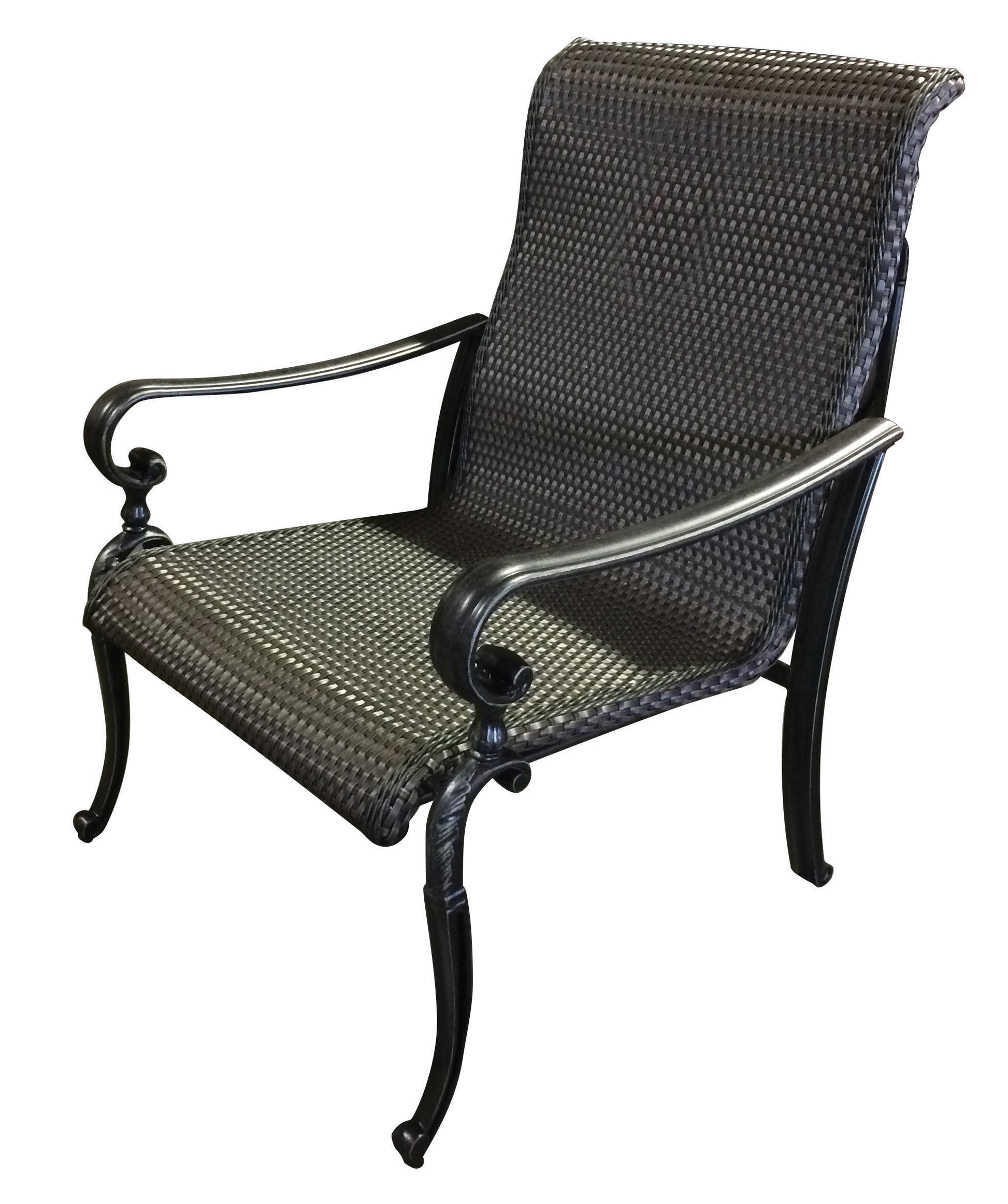 Bridgeton Moore presents the Wyndemere Club or Chat Style Chair a comfortable deeper seating Chair. Designed for style and comfort this chair is a popular choice. The chair's finish features, a rich ebony black tone with hand applied soft silvery white subtle dry brushed accents that accentuate the design elements before applying the multi-step powder coat finishing protection for longer lasting outdoor use. The chair features shapely contoured back, intricately woven in a unique pattern by hand, in all-weather natural looking synthetic polyethylene wicker weave.