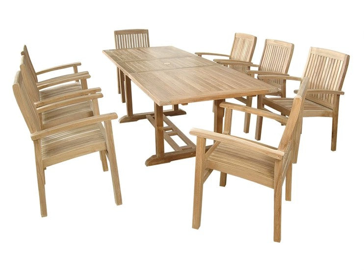 The Bahama Rectangular Extension Table makes the perfect addition to your patio or backyard. The unique built-in butterfly pop-up leaf enables you to open and close your table in less than 15 seconds. The leaf folds away for easy storage. This table stands 29″ high and is 35″ width by 71″ long and if fully extended can reach to 94″ long. The table can be extend with 1 or 2 leaves, seating 8 to 10 people comfortably. The table has an 2" umbrella hole with brass plug when not in use in the center when the leaf opens. This table set arrives with eight Sahara Stacking Armchairs with traditional curved back style and contoured seats to support your back comfortably. Stackable chairs also allow for easy storage management. The style will never go out, but quietly blends with any other design. All pieces built with extra thick Grade-A authentic teak wood thats unfinished and sanded smooth in its natural form and color.