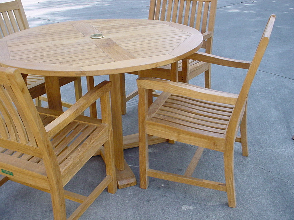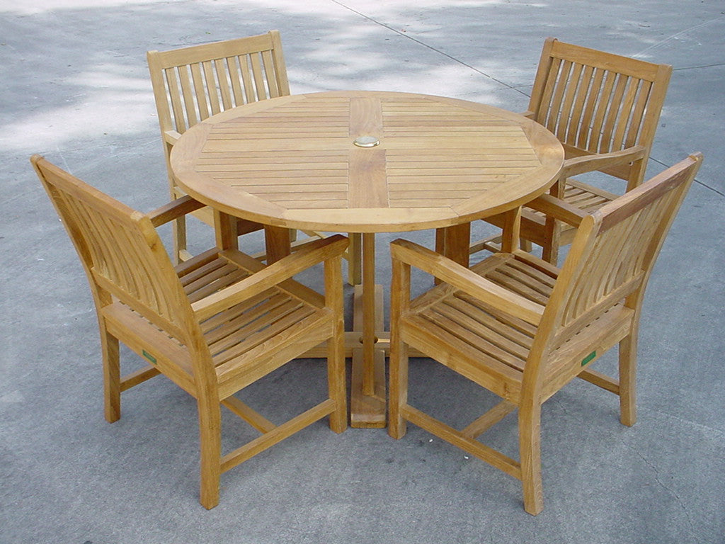 This traditional-style Tosca Dining Set has an ideal design for outdoor dining and relaxation for your garden, yard or home. Featuring the 47" Tosca Round Table, it features an umbrella hole in the center included with a brass plug when not in use. Also includes four simple and classic Rialto Dining Armchairs with contoured seats and angled back and armrest for added support and comfort. This solid construction with beautiful and traditional design will surely provide your family with many years of outdoor recreation. All pieces constructed from Grade-A Teak wood unfinished.