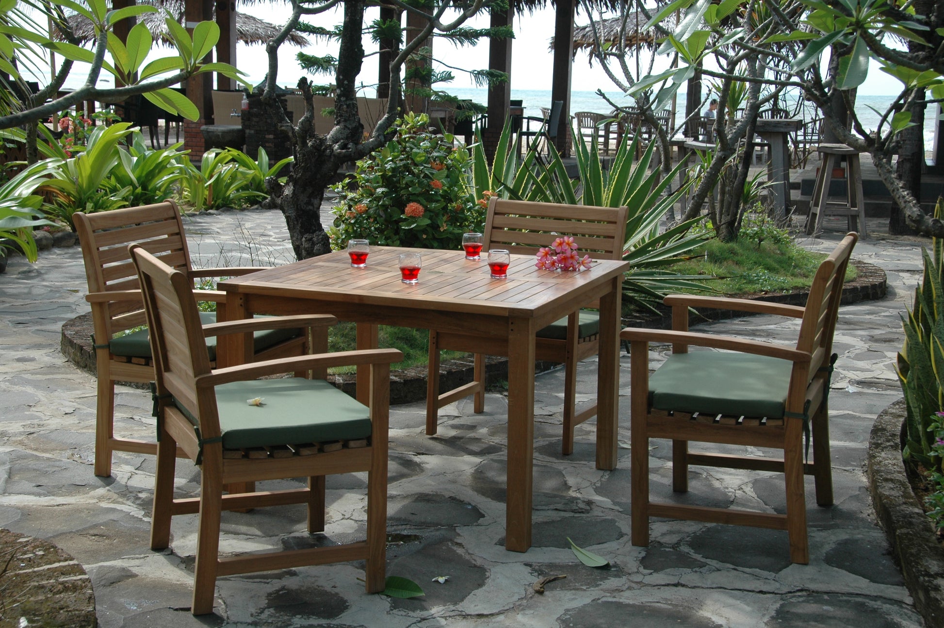 A spacious and durable teak outdoor dining set for the patio or yard, this set includes a Windsor 47” Square Table and four Chicago Dining Armchairs. Made of solid teak wood, the Windsor 47” Square Dining Table is a bulky and quality sized table that’s durable and stable; while the Chicago Dining Armchair is designed with teak slats that contour and curve on the back and seat for a comfortable sitting experience. The perfect table set for outdoor dining or a game of cards, guests will be amazed by its quality built frame and size as well as the smoothness and touch of the authentic teak wood. Table includes an umbrella hole with brass plug when not in use.