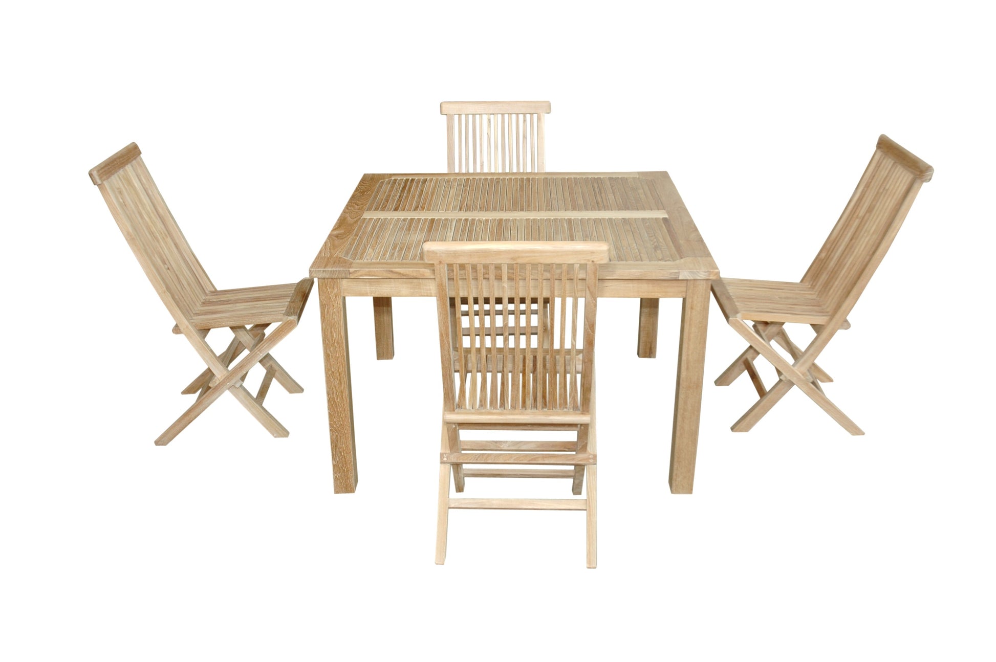 Enjoy outdoor dining under the stars or a cool summer lunch in the comfort of your yard with the Windsor Table and four Chairs SET-62. One of our most popular design, the curved high back folding chair exudes comfort while easy movement and storage is a convenience of the folding chairs. Also features the quality built 47" Windsor Square Table with small table slats for a quality look. Add all weather Sunbrella cushions to create more color accent and comfort for this set. It seats two to four people comfortably; all pieces made from genuine grade-a unfinished teak.