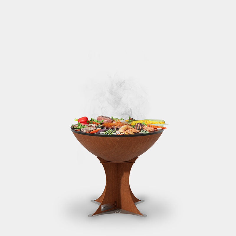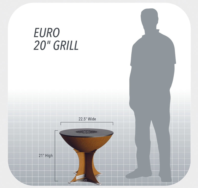 The Arteflame Classic Euro 20" Portable Charcoal Grill and Fire Bowl is a one of a kind grilling experience. The cooktop is made of extra thick carbon steel and the spun bowl is high grade US CORTEN steel or "weathering" steel. The base is crafted of CORTEN steel components that sit on a stainless steel footer. The base fits together easily without using any tools. The Arteflame is designed with "Classic" lines and unsurpassed functionality.