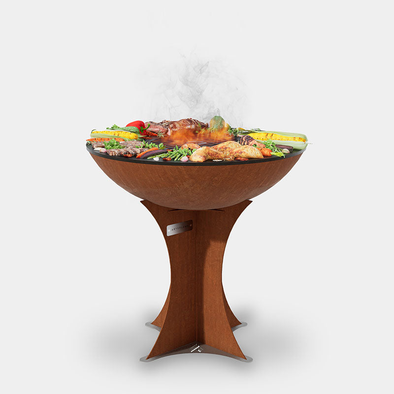 The Arteflame Classic Euro 30" Portable Charcoal Grill and Fire Bowl is a one of a kind grilling experience. The cooktop is made of extra thick carbon steel and the spun bowl is high grade US CORTEN steel or "weathering" steel. The base is crafted of CORTEN steel components that sit on a stainless steel footer. The base fits together easily without using any tools. The Arteflame is designed with "Classic" lines and unsurpassed functionality.