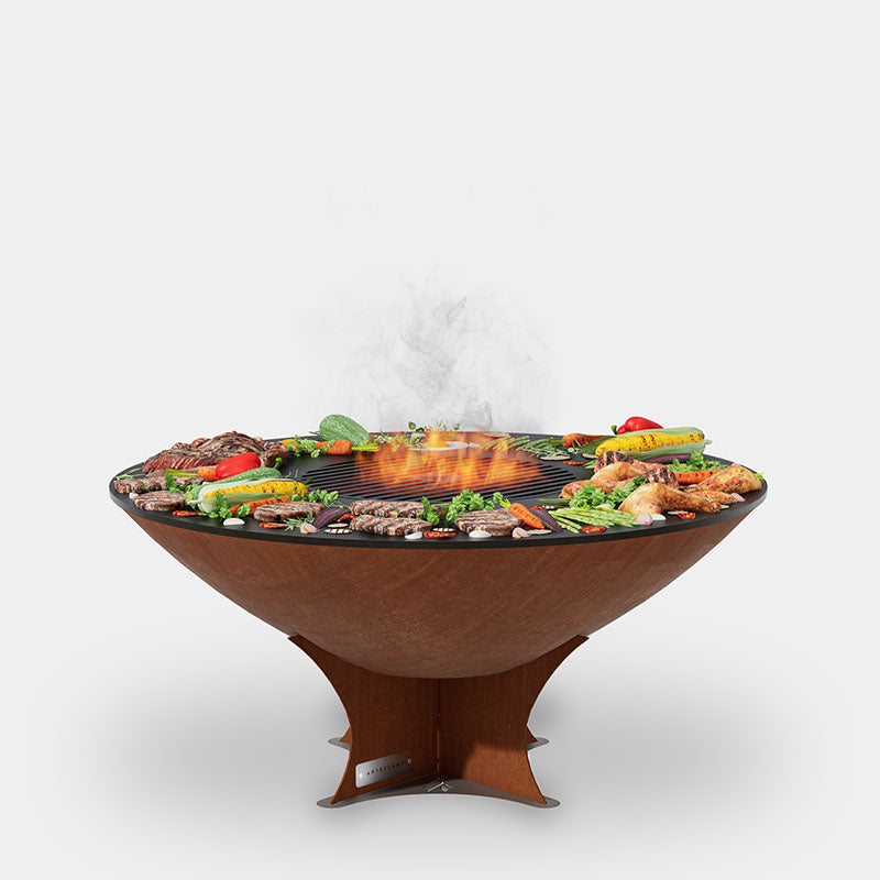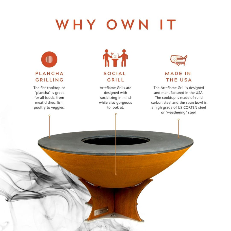 The Arteflame Classic 40" grill is a one of a kind grilling experience. The cooktop is made of 1/2" carbon steel and the spun bowl is a high grade of US CORTEN steel or "weathering" steel. The round base is also crafted of CORTEN steel and is designed with "Classic" lines and unsurpassed functionality.