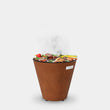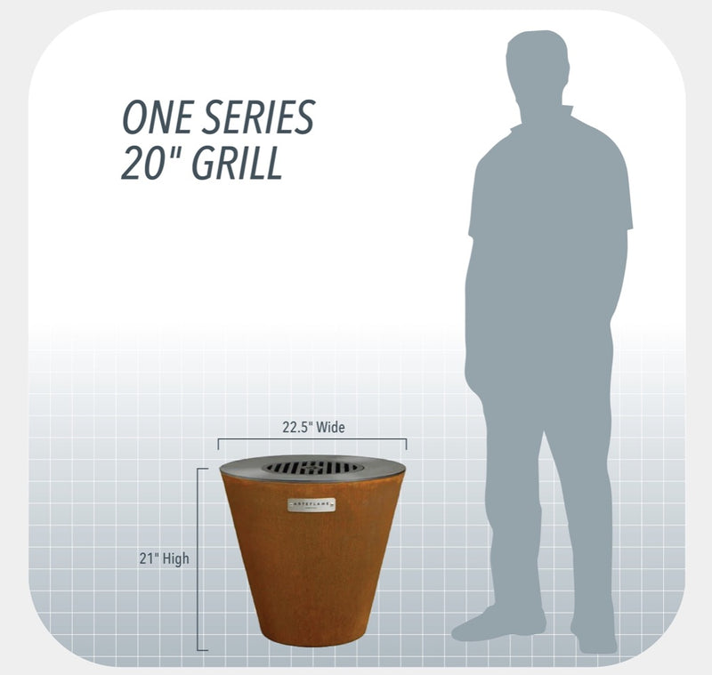 The new One Series Arteflame design is based on the same concept as the Classic Arteflame 40" grill but in a smaller format. The smaller design is fueled by charcoal or wood chunks and crafted in two pieces - a 1/4" carbon steel cooktop and a US CORTEN steel base made to last a lifetime. It is 20" tall and the cooktop is 22.5" in diameter, the same as a standard kettle style grill. The smaller format heats up faster and uses less fuel making it ideal for everyday grilling for a family.