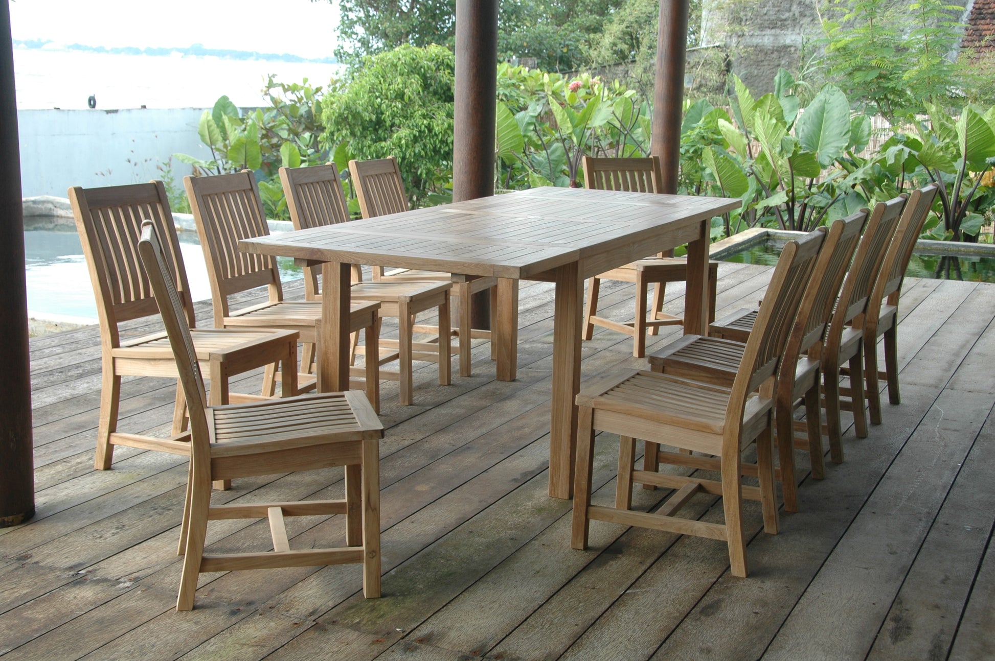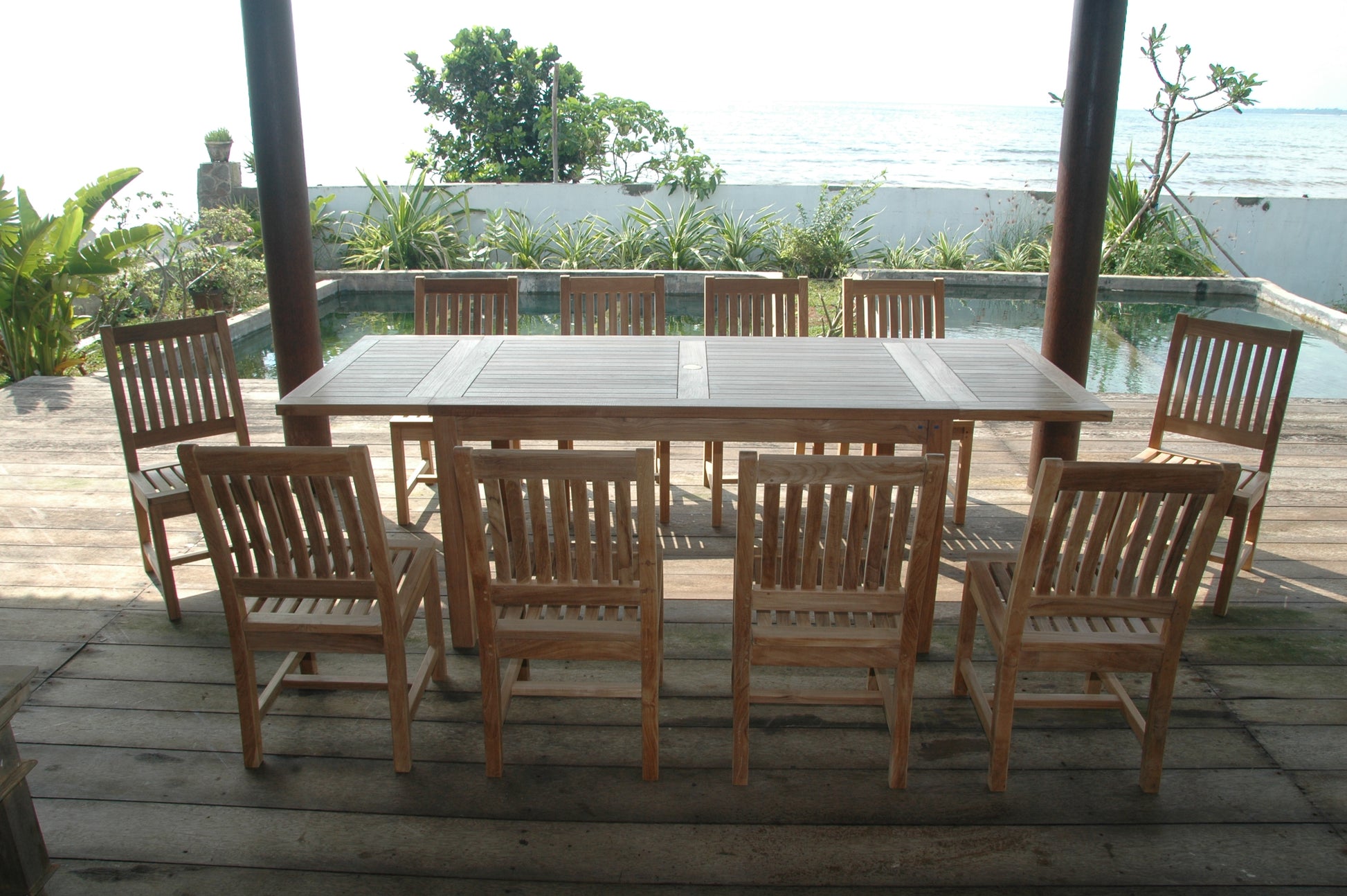 This Solid Teak “Rectangular Extension Table” makes the perfect addition to your home or backyard. Our extension table begins as a 59-inch long rectangular and easily extends with detachable leaves to a 95-inch long rectangular in less than 15 seconds. The table can be extended with 1 or 2 leaves, seating 6 to 10 people comfortably. Available with umbrella hole in the center and brass plug when not in use. The table arrives with 10 Rialto Dining Chairs featuring curved seating and back support which makes it a most comfortable dining chair to sit on. Add all-weather cushions from Sunbrella for extra comfort. All pieces manufactured from premium grade unfinished teak wood.