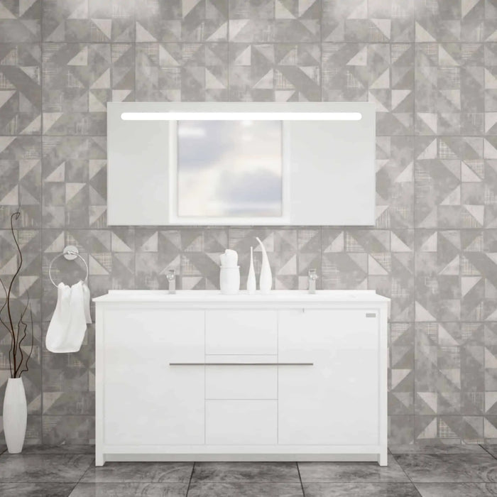 Casa Mare Alessio single hole rectangular wall mounted sink and vanity combo bring a touch of beauty to your bathroom with an integrated white acrylic sink. Available with single hole for faucet mounting. The 2 door cabinet construction gives you plenty of storage for bathroom accessories. Premium Turkish brand. It is a great choice for modern bathrooms. Lighted LED frameless backlit wall mirror. Side cabinet is also available but not included in the set you need to buy separately. Best product for remodeling your bathroom.