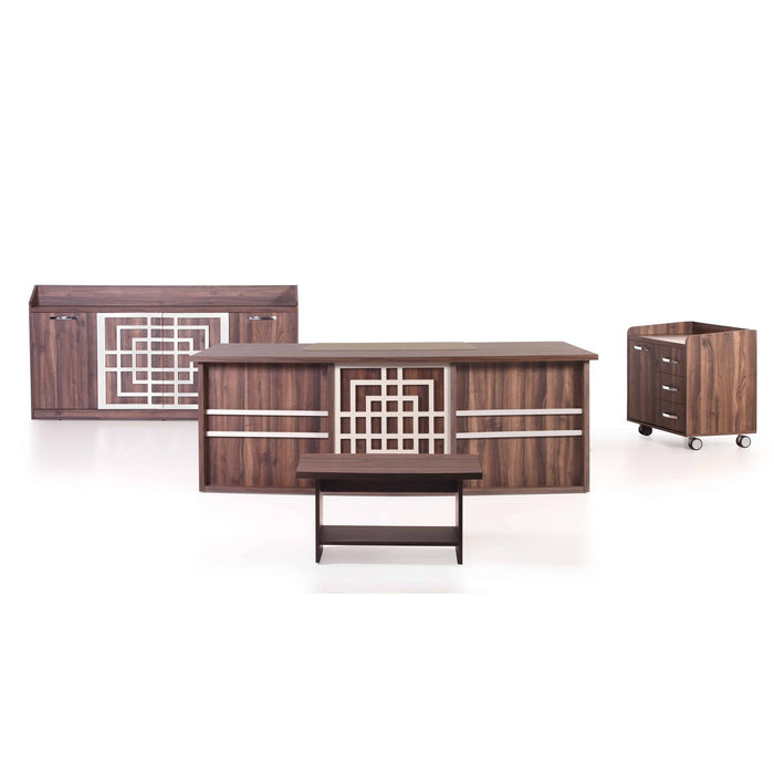 The CASA MARE ASTORIA office set includes a sleek executive desk, a versatile credenza with built-in drawers for computer usage, a handy low wall cabinet with both open and closed storage options for organization and a rustic-industrial coffee table for meetings and gatherings. Keep your home-office tidy and all your stationery and office supplies in one place with this affordable set.