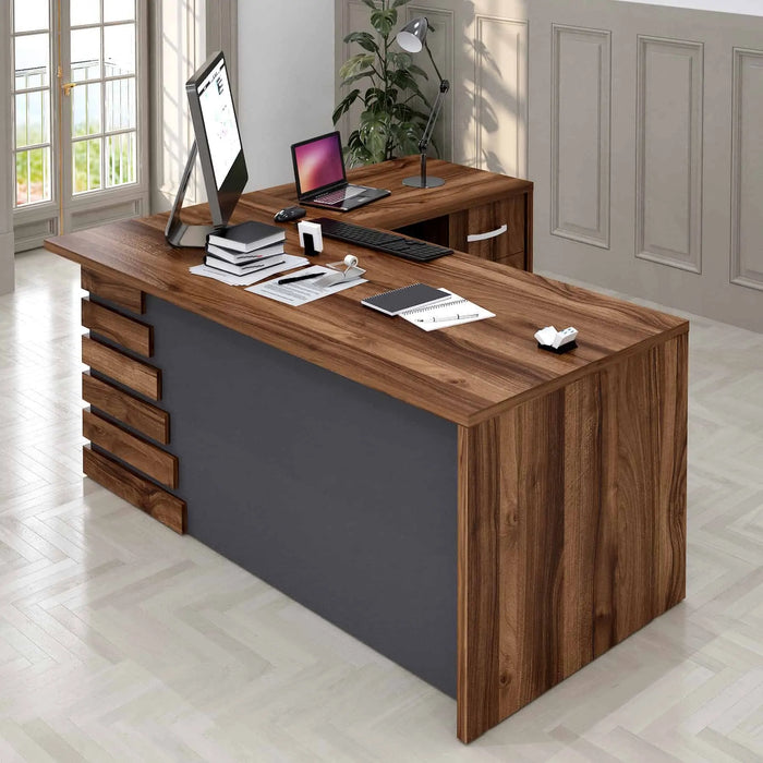 CASA MARE ATLAS L-shaped design saves space while offering plenty of room to spread out. Built from durable engineered wood, this modern office desk is built to last and is sturdy enough to hold all of your items. Super sturdy, rugged and reliable mechanical design to ensure the excellent stability of the desk. Features three drawers to keep everything from office supplies to files safely stowed and at an arm’s reach. Desk storage details includes three box drawer for supplies. File drawer with full extension slides holds letter-size hanging files. Enjoy a beautiful traditional look with smart features for your convenience.