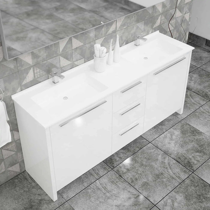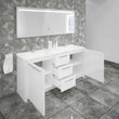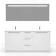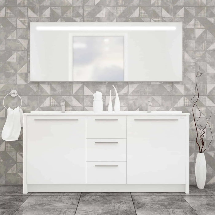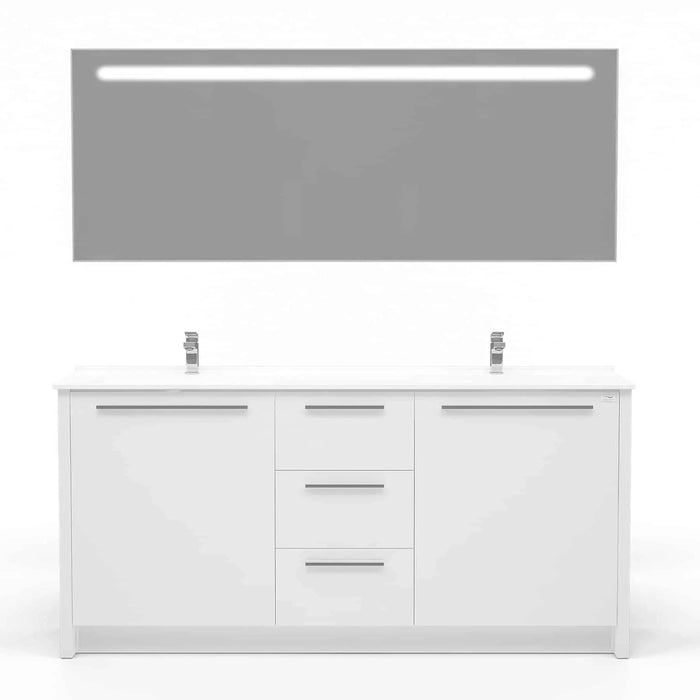 Casa Mare Nona dual hole rectangular sink and freestanding vanity combo bring a touch of beauty to your bathroom with dual white sink and glossy grey main cabinet. Available with single hole for faucet mounting on both sides. The soft close drawer and door construction gives you plenty of storage for bathroom accessories. Lighted LED wall mirror. Premium Turkish brand. It is a great choice for modern bathrooms.