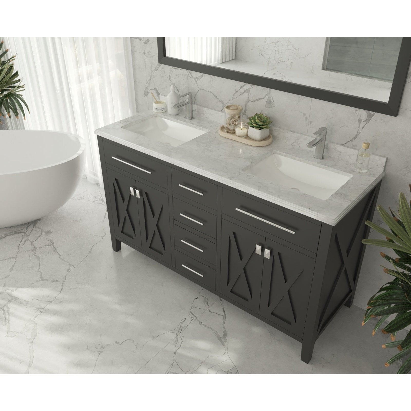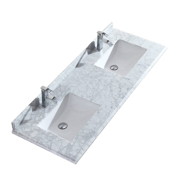 Laviva Forever 60" Single Hole White Carrara Marble Countertop with Double Rectangular Ceramic Sinks 313SQ1H-60-WC