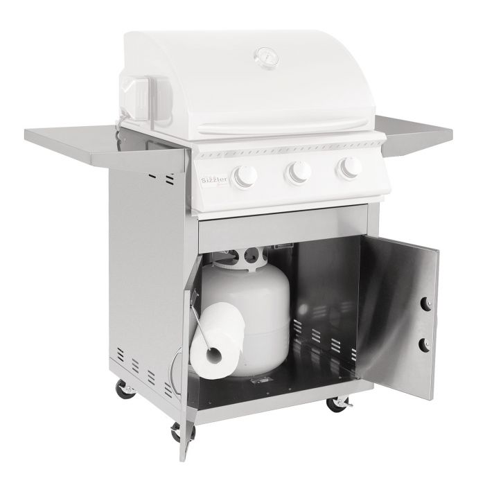 Summerset CART-SIZ26 Sizzler Series Cart, 26-Inch provides the necessary grill base for your 26-inch Summerset Sizzler gas grill. The stainless steel cabinet features heavy duty locking casters, two stationary side shelves and two double storage doors. The LP tank can be stored directly within the cabinet along with any other grilling accessories you need to store outdoors. Enhance the look of your patio or deck with this premier stainless steel grill base; designed with utility and longevity in mind, the CART26SIZ will help make the most of your grilling outdoor space for many years to come.
