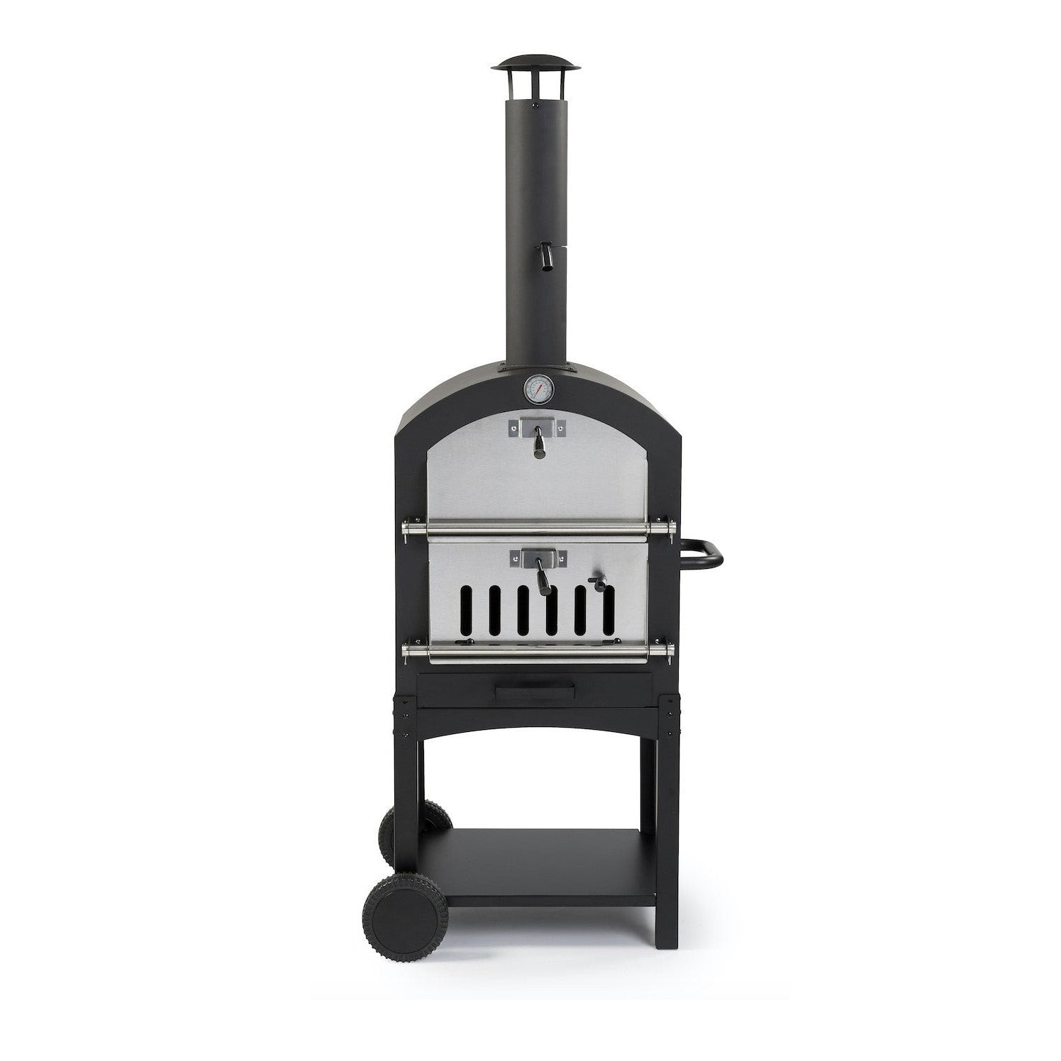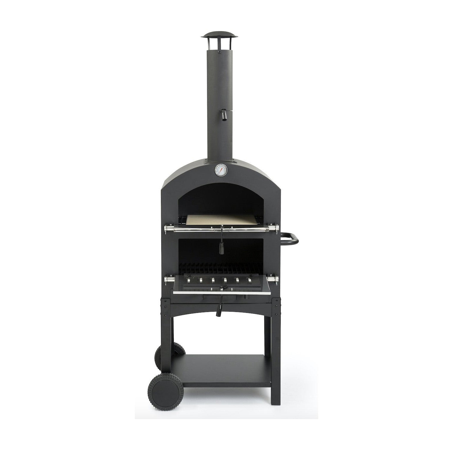 - Powder-coated steel oven exterior with stainless steel doors and cooking grates.